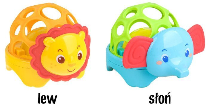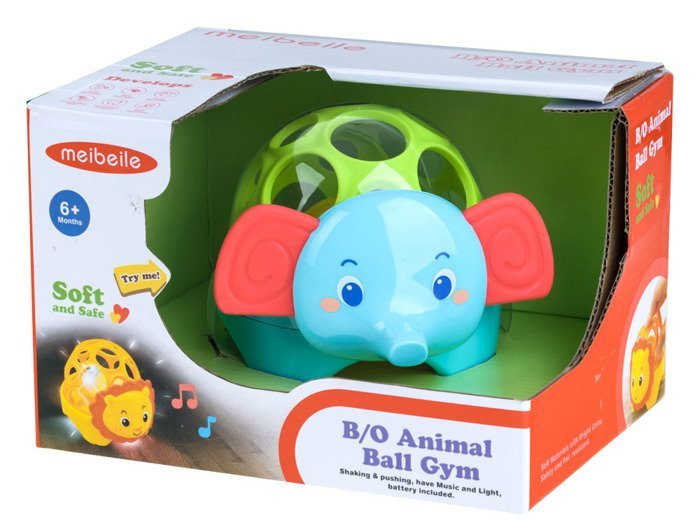 Barevná safari zvířata. Uvnitř zvířátka je míček, který svítí a při hře vydává veselý zvuk. Hračka má pružný ažurový design a měkké uši nebo hřívu.